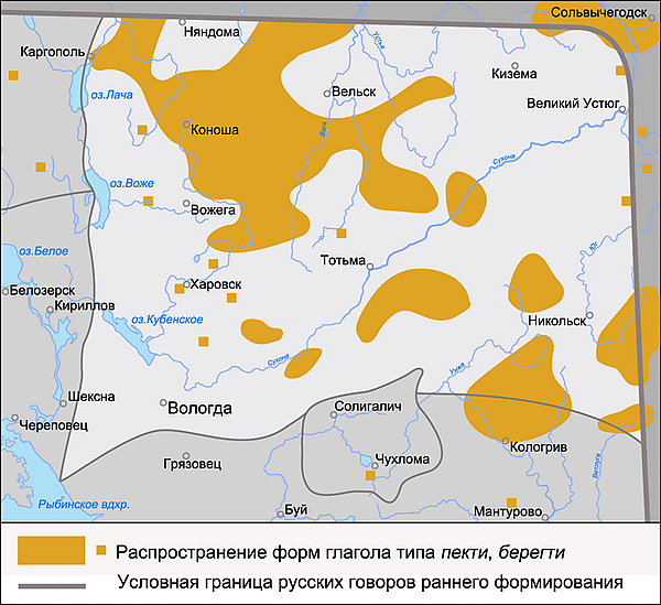 - Распространение словоформы л[е]г (повелительное наклонение глагола лечь) при общесевернорусском л'[а]г.