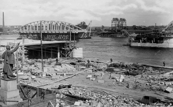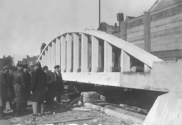 В 1932 году, перед началом строительства моста, была изготовлена модель постоянных арочных пролётных строений в 1/5 натуральной величины (20 м), которая была установлена в Таврическом саду и испытана почти двойной расчётной нагрузкой[9]. Испытание проходило с участием Г. П. Передерия, В. И. Крыжановского, В. К. Качурина, А. А. Долженко.