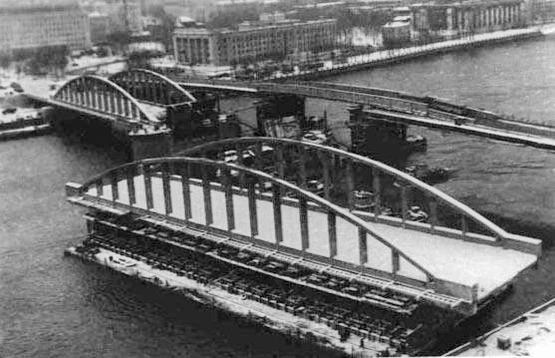 Мост сооружён в 1932—1936 годах[10]. Строительство моста велось под руководством академика Г. П. Передерия, В. И. Крыжановского и главного инженера Ленмосттреста Ш. А. Джабуа[11]. Из-за большой глубины Невы (до 15 м), интенсивного судоходства и обильного ледохода железобетонные пролётные строения бетонировались на подмостях на берегу[9]. К месту установки готовые арки транспортировались на понтонах при помощи лебёдок. Работы по транспортировке пролётных строений велись под руководством крупного судостроителя и математика академика А. Н. Крылова. Под его же руководством были рассчитаны и изготовлены гигантские понтоны[12]. Передвижение понтонов было поручено ЭПРОНу — «Экспедиции подводных работ особого назначения», специализирующейся на подъеме затонувших судов и располагающей соответствующими мощными лебёдками, тросами, якорями и т. д.[9] Операция по перевозке на понтонах пролётных строений массой до 4000 т была осуществлена в практике мостостроения впервые[13][8]. Первая конструкция была установлена 6 ноября 1935 года, вторая — 11 августа 1936 года. 6 ноября 1936 года мост был торжественно открыт для движения[14]. Одновременно с мостом была построена пятикилометровая набережная левого берега, которая стала первым большим послереволюционным строительством набережных в городе[6][7]:33.