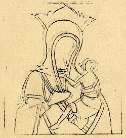 В соответствии с каноном на Богоматери коричневый мафорий, чепец, рукав, а также опоясание младенца зелёные. Гиматий маленького Иисуса отливает золотом. Им же украшены каймы одеяния Марии с изящным растительным орнаментом у левого плеча. Антонова особо отмечала изощрённость уверенного рисунка и стройность композиции, мастерство изображения блеска одежды Иисуса и тонкость «вохрения» у глаз Богоматери. Именно оно, по мнению советского искусствоведа, создавало в лице Марии душевное движение, отражённое на Владимирской иконе после реставрации XVI века и утраченное к настоящему времени. Вохрение традиционно: «поверх зелёного санкиря сделано высветление коричневой охрой, но с таким умением, что иконный лик выражает неприкрашенное страдание». Очертания фигур Богородицы и младенца в некоторых местах обведены сохранившимся золотым контуром, по словам Валентины Антоновой, «как это было принято для особо изысканных изображений». Скорбь на лице Марии воплощена также с помощью рисунка — сведены брови и «опускаются», по выражению Антоновой, к вискам углы глаз. Такой рисунок встречается лишь на тех иконах Владимирской Богоматери, которые отражают её состояние после реставрации XVI века[16].