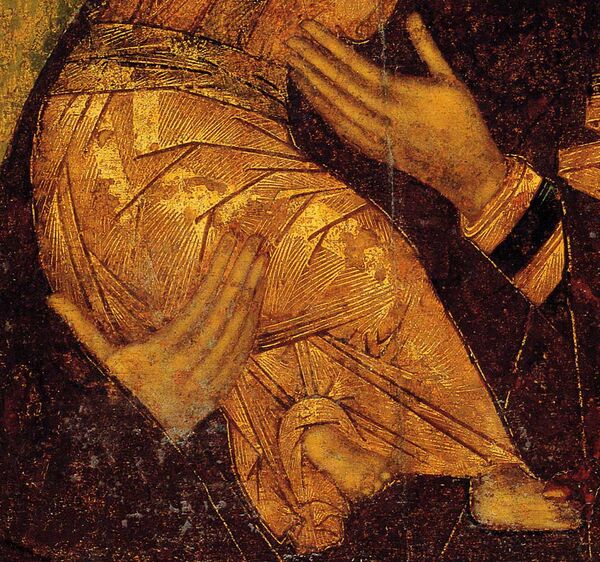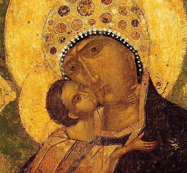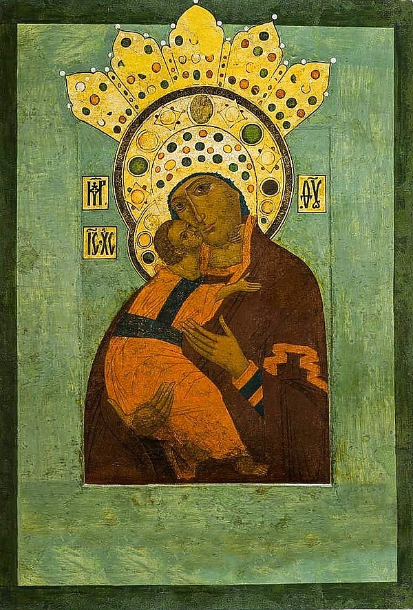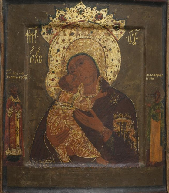 В статье из «Новгородского исторического сборника» за 2000 год Элиса Гордиенко писала, что для человека XVI века действительность ощущалась как удалявшиеся друг от друга небесный и земной миры. На иконах этого времени «горний мир представал в образе карающего, немилосердного Бога», а противостоял ему «скорбный образ Богородицы и святых заступников, исполненных веры в духовные силы человека». Свою точку зрения исследователь подтверждала целым рядом сохранившихся до нашего времени икон, среди которых Богоматерь Владимирская-Волоколамская из Иосифо-Волоцкого монастыря и Богоматерь Владимирская-Волоколамская 1561 года из Софийского собора в Великом Новгороде[51].
