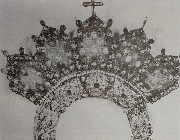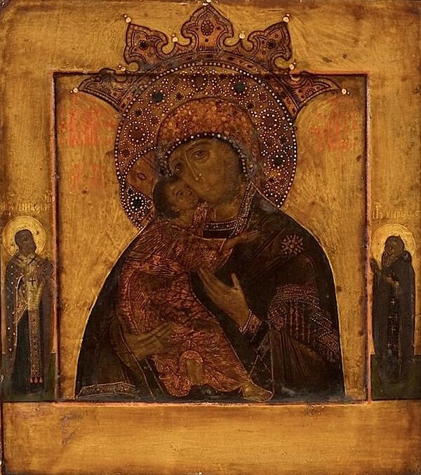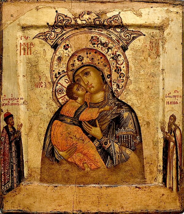 Икона Богоматерь Волоколамская представляет собой чудотворный список с почитаемого Русской православной церковью образа Владимирской иконы Божией Матери, выполненного в Византии в XII веке[4][5]. Владимирская икона была отреставрирована (поновлена) несколько раз ещё во времена Московского царства. Живописный слой её был обновлён, в частности, в 1514 году[Прим 1], а оклад иконы — в 1566 году[7]. Доктор искусствоведения, академик Российской академии художеств Анна Рындина писала, однако, в статье «К истории реставрации окладов иконы Богоматерь Владимирская в XV веке» (1997) ещё и о реставрации оклада в 1514 году, когда были восполнены утраты, появившиеся со времени предыдущей реставрации, проведённой при митрополите Фотии, и, по её мнению, была выполнена эффектная городчатая корона, дошедшая до нашего времени (золото, скань, Музей «Московский Кремль», № МР 3406)[8].