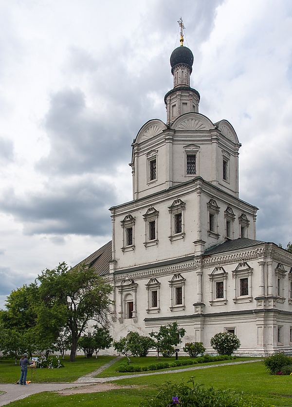 Вслед за доктором исторических наук Ольгой Подобедовой Алексей Оболенский выделял следующие общие особенности работ царской мастерской: повествовательность, сложность аллегорических сюжетов, грандиозность замысла, сложные композиционные построения, отличавшиеся одновременно «дробностью, мелочностью письма, запутанностью и перегрузкой деталями». Автор статьи присоединился к мнению, что Волоколамская икона является даром Малюты Скуратова. Оболенский высказывал мнение, что, так как посвящённый Сретению Владимирской иконы Пресвятой Богородицы храм был возведён племянником Малюты Богданом Бельским только после смерти дяди, Волоколамская икона была изначально помещена у Царских врат Успенского собора и не перемещалась в Сретенский храм после завершения его строительства[11].