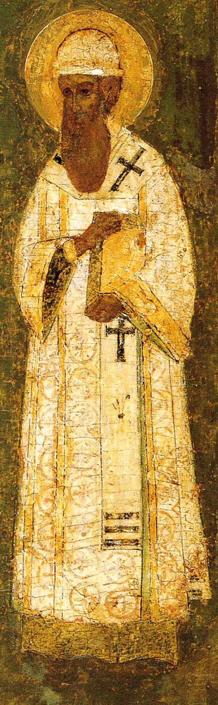 В XIX веке изображения святителей были также восприняты как митрополиты Московские (так у рассказывавшей об этом Валентины Антоновой, официальный же титул — митрополиты Киевские и всея Руси, но с местом пребывания кафедры в Москве) Иона (слева) и Алексий (справа). В ходе реставрации Виктор Брягин пришёл к выводу, что весь фон на полях иконы был поновлён. В процессе раскрытия первоначального фона были обнаружены следы написания имени святителя в левой части иконы: «ГОРО(Н)ТЕ(И)». Валентина Антонова сделала вывод, что на полях действительно представлены митрополиты Московские в саккосах, клобуках и соответствующих головных уборах, но это не Иона и Алексий, а митрополит Киевский Киприан (справа) и редко изображаемый на иконах митрополит Московский и всея Руси Геронтий (слева). Изображение Киприана полностью соответствует требованиям иконописного подлинника: на голове шапка, седой, борода длиннее, чем у Власия, и раздваивается на конце. Изображение Геронтия также соответствует иконописному подлиннику: седой, борода длиннее, чем у Власия, тупая на конце, святительские ризы, лазоревый саккос, клобук[15].