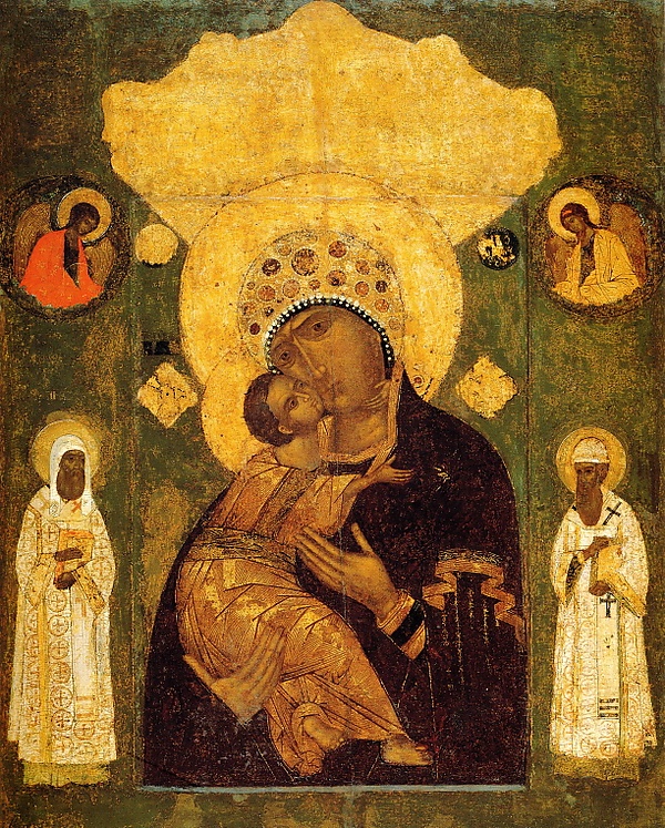 И Киприан, и Геронтий связаны с иконой Владимирской Богоматери: при Киприане икона впервые прибыла из Владимира в Москву, что описано в летописной повести под 1395 годом, а при Геронтии в 1480 году икона окончательно осталась в Москве. Волоколамская икона по легенде предназначалась в Иосифо-Волоцком монастыре для церкви Сретения иконы Владимирской Богоматери[Прим 2][7]. Героями таких её встреч в разное время стали именно эти святители[15]. Некоторые современные искусствоведы продолжают именовать изображённых на картине святителей митрополитами Петром и Ионой. Так поступает, в частности, Энгелина Смирнова в книге «Московская икона XIV—XVII веков» (1991)[9] и Людмила Щенникова в IX томе «Православной энциклопедии»[12].