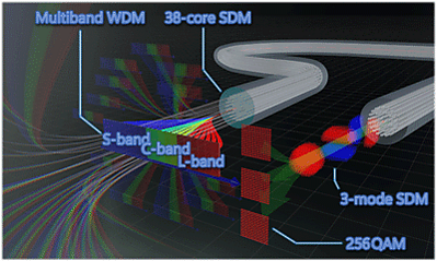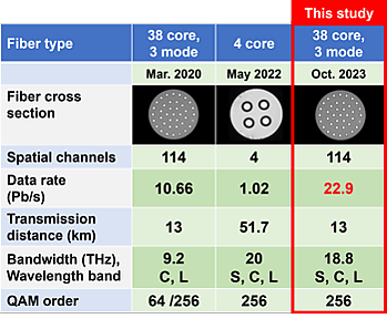В ноябре 2023 года исследователи японского Национального института информационно-коммуникационных технологий (NICT) установили новый рекорд скорости передачи данных по одному оптоволоконному кабелю — 22,9 петабита в секунду или 22,9 млн Гбит/с[7]. Это примерно в 20 раз превышает весь интернет-трафик в мире, передаваемый каждую секунду. Кроме того, это более чем в два раза превышает предыдущий мировой рекорд в 10,66 Пбит/с. Информация была передана на расстояние 13 км[8].