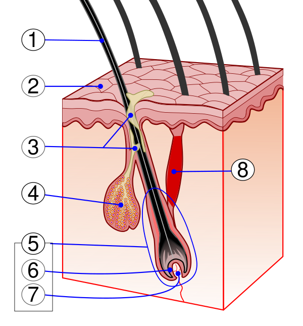 К другим компонентам волосяного фолликула относятся сальные (их обычно 2-3) и потовые железы, выделяющие секрет, который образует на поверхности кожи защитный гидролипидный слой.