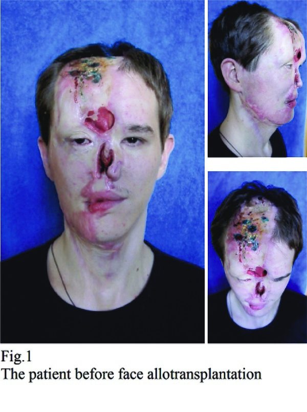 Пациент — рядовой армии (19 лет), который в течение трёх лет лечился в госпиталях по поводу 19 % электроожога головы и тела, травм кисти и нижних конечностей, катаракты обоих глаз. Несмотря на проведенное лечение и более 30 реконструктивных операций, удовлетворительный эстетический и функциональный результат не был достигнут. Пострадавший находился в депрессии с суицидальными попытками, при полной социальной несостоятельности. Ко времени пересадки у пострадавшего отмечались дефекты теменной, лобной областей, лобных пазух носа, губ, рта. В качестве донорского трансплантата использовано лицо 51-летнего мужчины, умершего в результате черепно-мозговой травмы. Пересадка выполнена при оптимальной иммунной совместимости реципиента и донора.