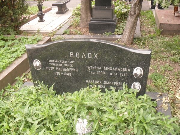 Генерал-лейтенант танковых войск Пётр Васильевич Волох 25 августа 1943 года погиб при налёте авиации противника. Похоронен на Новодевичье кладбище в Москве.