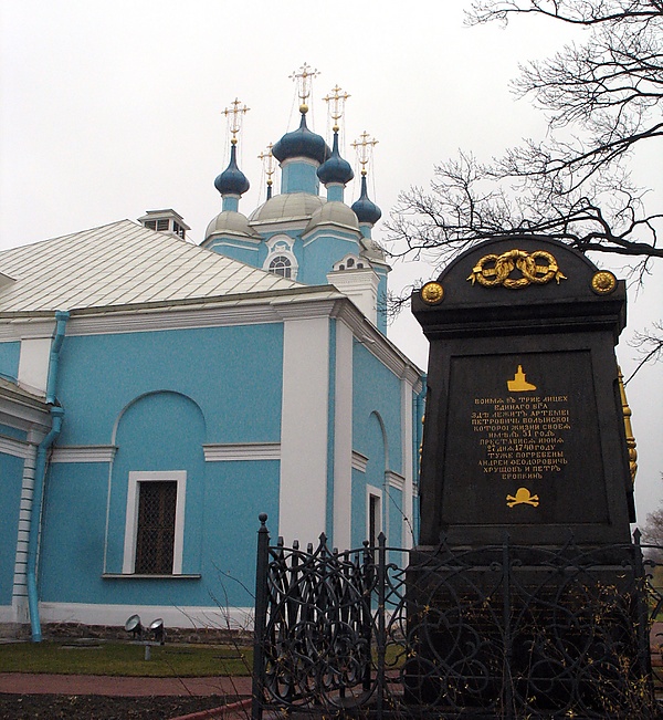 Возвращённые из ссылки на другой год после казни дети Волынского, с разрешения императрицы Елизаветы Петровны, поставили памятник на могиле своего отца, похороненного вместе с Хрущовым и Еропкиным близ ворот церковной ограды Сампсониевского храма (на Выборгской стороне). В 1886 году, по почину М. И. Семевского, на пожертвования частных лиц был воздвигнут на могиле Волынского, Еропкина и Хрущова новый памятник.