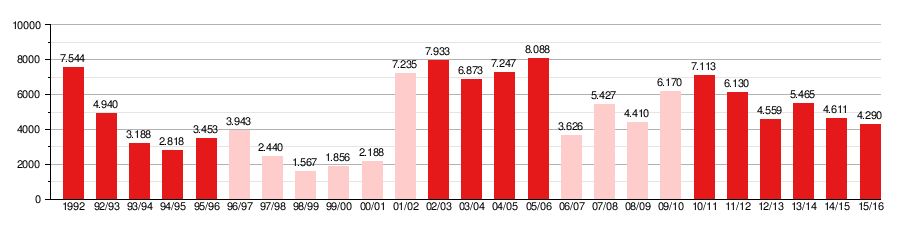 - Светло-розовый — первая лига (1997/98 — 2001/02, 2006/07 — 2009/10)