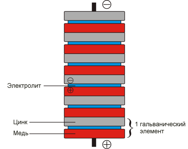 Так был изобретён «элемент Вольта» — первый гальванический элемент. Для удобства Вольта придал ему форму вертикального цилиндра (столба), состоящего из соединённых между собой пластин (дисков) из цинка, меди и сукна, пропитанного кислотой. Вольтов столб высотою в полметра создавал напряжение, чувствительное для человека.