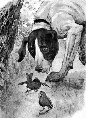 Моя собака медленно приближалась к нему, как вдруг, сорвавшись с близкого дерева, старый черногрудый воробей камнем упал перед самой её мордой — и весь взъерошенный, искажённый, с отчаянным и жалким писком прыгнул раза два в направлении зубастой раскрытой пасти. Он ринулся спасать, он заслонил собою своё детище… но всё его маленькое тело трепетало от ужаса, голосок одичал и охрип, он замирал, он жертвовал собою!
