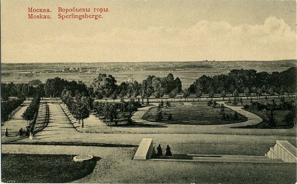 В 1935 году Воробьёвы горы в честь В. И. Ульянова-Ленина были переименованы в «Ленинские», официально носили это название до 1999 года[9][28][29] — тем не менее, название «Воробьёвы горы» сохранялось в обиходе (так, предпоследняя глава романа М. А. Булгакова «Мастер и Маргарита» (1929—1940), носит название именно «На Воробьёвых горах»). Парк на территории Ленинских гор разбили в 1930-х годах по проекту архитекторов В. И. Долганова и М. И. Прохоровой. В 1948 году по проекту Долганова сооружена смотровая площадка[30].