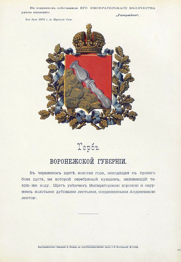 Герб второй Воронежской губернии был высочайше утверждён 5 июля 1878 года (закон № 58684). Официальное описание герба: