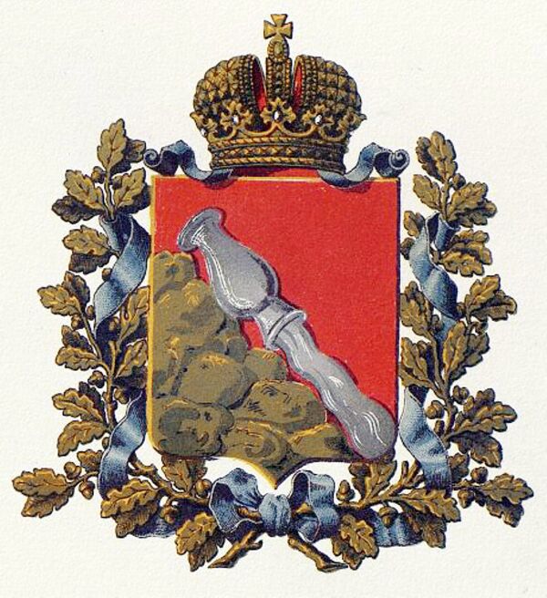 «В червлёном щите, золотая гора, исходящая с правого бока щита, на которой серебряный кувшин, изливающий такую же воду. Щит увенчан Императорскою короною и окружён золотыми дубовыми листьями, соединёнными Андреевскою лентою».