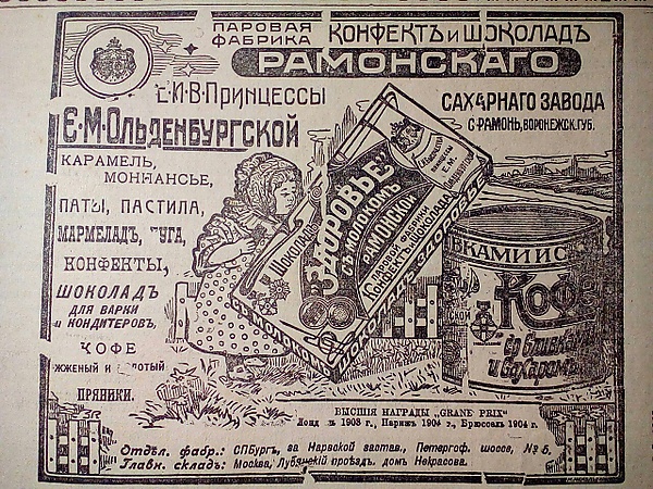 Ещё в 1900 году принц Александр Петрович Ольденбургский со своей женой — принцессой Евгенией Максимилиановной Ольденбургской, построили в Рамони (ныне посёлок городского типа в Воронежской области) фабрику, которую назвали «Паровая фабрика конфет и шоколада»[2] (полное название производства было таковым: «Рамонская паровая фабрика конфет и шоколада Ея Императорского Высочества принцессы Евгении Максимилиановны Ольденбургской»[3]). До этого, в 1878 году, Евгения Максимилиановна купила в Рамони у дворянки Марии Николаевны Вельяминовой имение, включавшее более 3000 десятин земли и свеклосахарный завод.