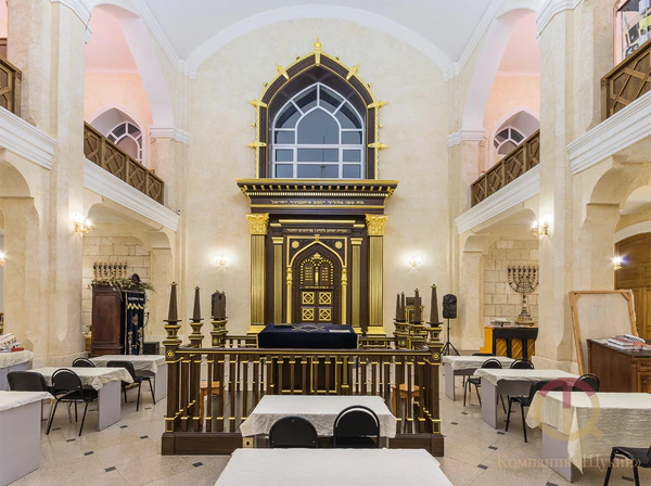 Ритуальная мебель для внутреннего убранства синагоги была изготовлена по проекту Симхи Палух и Вадима Швейбиша. Она включает в себя Арон Кодеш, Биму, Амуд и другие элементы. Главный из них — Арон Кодеш — на иврите означает Ковчег Святыни. В наши дни это большой и красивый шкаф для Свитков Торы. Корпус Арон Кодеш, с точки зрения архитектурной композиции, представляет собой три портала, расположенные друг в друге. Порталы как будто вырастают один из другого, похожие по материалу и цвету, и при этом совершенно разные стилистически.