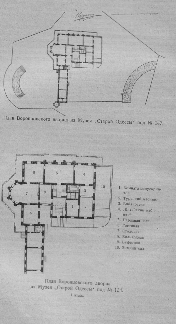 …все убранство комнат было в своё время перевезено в Алупкинский дворец, роскошная же библиотека вошла в состав одесской «Библиотеки высшей школы». Паркет, двери и камины сильно попорчены. Потолковая живопись от сырости местами испортилась. …камин, находящийся в большой зале. Он гармонировал своими цветными камнями, изображавшими птиц и растения, с росписью верхней части стен под карнизом (гирлянды цветов и венки). К сожалению, эти цветные камни сорваны, … Камин следующей за залой комнаты, представляющий своим рисунком подражание античной вазовой краснофигурной живописи (по чёрному полю розетки, вазы и две летящих женских фигуры красного цвета), сильно обветшал и попорчен.