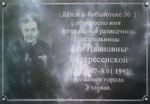 - В 1999 году городской библиотеке города Узловая, где родилась Воскресенская, присвоено её имя, а также в 2002 году на её здании установлена мемориальная доска[22].