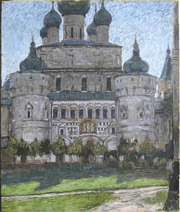 На этюде представлен вид на Воскресенскую церковь в Ростове Великом в солнечный день. Изображение выполнено в жанре ведуты с использованием приёма контрового освещения, что подчёркивает игру света и тени на архитектурных формах.