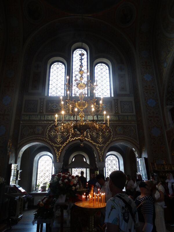 В византийских храмах интерьер был богатый, даже роскошный, создавая соответствующую религиозную атмосферу. Величью храма способствовала многоцветная мраморная облицовка, мозаики по золотому фону, фресковые росписи, декоративные каменные мотивы. Храм внутри расписан орнаментом и изображениями 4-х Евангелистов, Вознесения Христова, Покрова Божией Матери, Свят. Григория, Мученицы Татианы, Прав. Анны, Св. Алексия и Воскресения Христова. Великий витиеватый сложный орнамент в византийском стиле на стенах, двадцать восемь витражных окон придавали церкви особую светлость, прозрачность и праздничность.