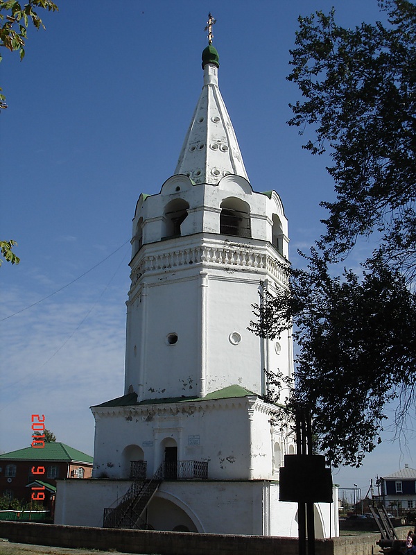 Колокольня возведена по образцу строившихся в Москве восьмигранных шатровых колоколен и состоит из четырёх частей: подклета (подвала), четверика, восьмерика и увенчанного крестом восьмигранного шатра. На первом и втором этажах колокольни в 1744—1857 годах хранился войсковой казачий архив, а в подклете долгое время держали преступников.