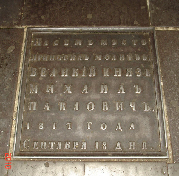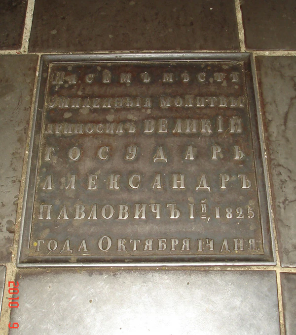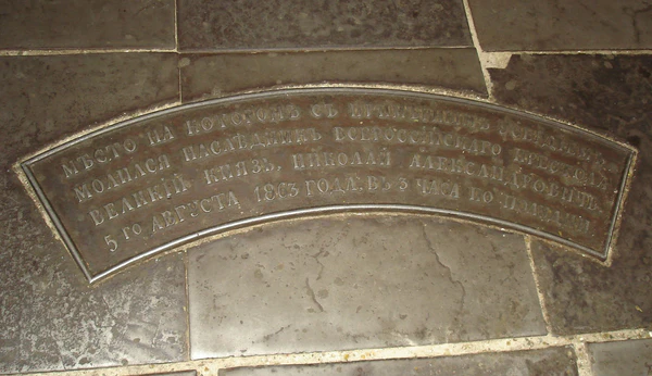 Из необычных деталей привлекают внимание металлические плиты перед алтарём, где находятся отлитые надписи о том, что на этом месте в своё время молились российские императоры и великие князья.