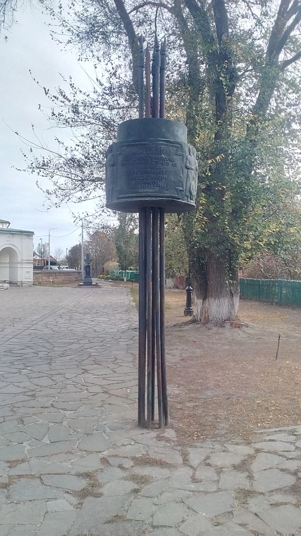 На майдане между папертью и колокольней выложены захваченные во время Азовском сидения трофеи: