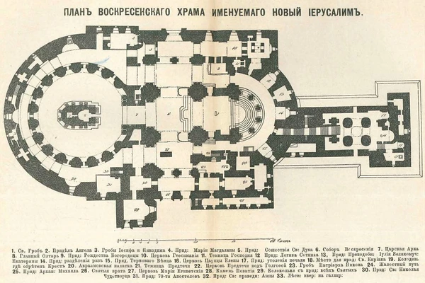 Идея Никона состояла в том, чтобы повторить храм Воскресения в Иерусалиме, чертёж и модель которого были даже специально привезены в Москву. Собор в плане соответствует обмерам иерусалимского храма, приведённым в «Проскинитарии» иеромонаха Арсения, была повторена и схема расположения отдельных помещений.