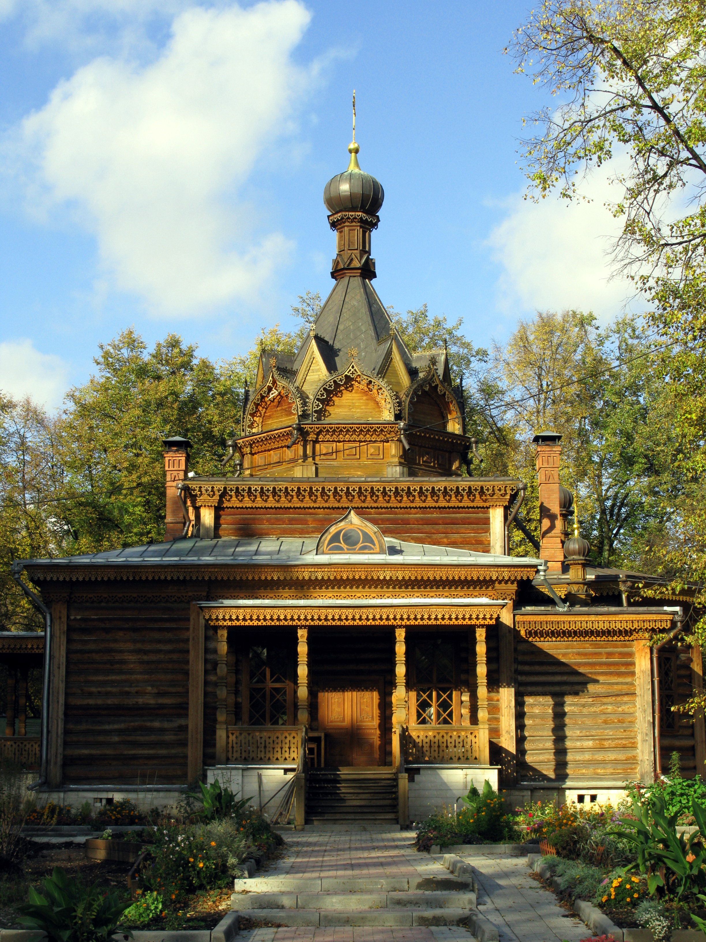 | Храм Тихона Задонского в Сокольниках | 1876 (перестроен к 2004 году) | Деревянный храм в русском стиле, построен по заказу городского главы И.А. Лямина архитектором П. П. Зыковым. Основной объём храма — кубический четверик, плавно переходящий к уменьшенному восьмерику, а затем к шатру, увенчаному маленькой луковичной главкой на восьмигранном барабане. В 1995—2004 годах был перестроен заново по проекту архитектора Н. С. Василенко. Главный престол — святителя Тихона Задонского. Приделы: |