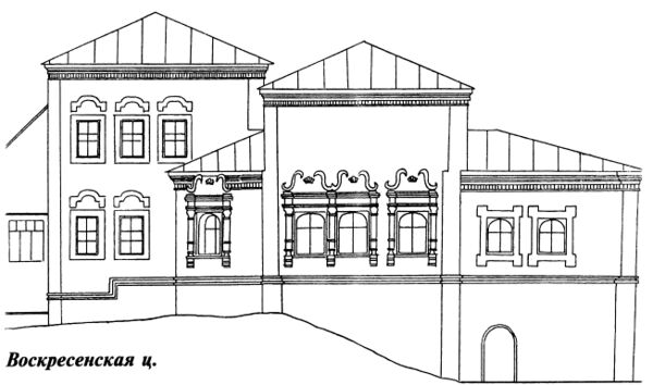 Храм бесстолпный, в прошлом пятиглавый с четырьмя глухими и одним световым барабаном. Барабаны, имевшие ярусную структуру, завершались луковичными главами. Четверик храма — двухсветный. В прошлом стены завершались полукружьями с окнами-люкарнами. Подобную конструкцию можно видеть в Воскресенском соборе города Чердыни. Сохранились декоративные наличники лучковых окон Воскресенской церкви. По бокам окна обрамлены тонкими колонками, опирающимися на фигурные консоли. В верхней части между двумя завитками расположена небольшая пальметта.