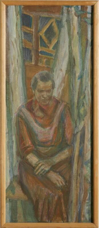 На картине представлен поколенный портрет пожилой женщины, сидящей фас с наклонённой головой. У неё короткие седые волосы, она одета в серо-розовый сарафан и серо-красную блузу. Женщина сидит, закинув ногу на ногу, а её руки сложены на уровне пояса. Фоном служит террасное окно с ромбовидным деревянным переплётом, а по правому краю композиции изображены листья цветка.