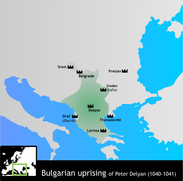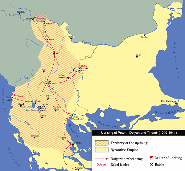 В 1040 году Пётр Делян, утверждавший, что является потомком Самуила, царя Болгарии, бежал из Константинополя и начал скитаться по болгарским землям, в конце концов достигнув Моравы и Белграда. Восстание вспыхнуло в Белграде, где Делян был провозглашён императором Болгарии[2], приняв имя святого императора Петра I. Болгары двинулись на юг, к последним политическим центрам своей бывшей империи — Охриду и Скопье. По пути к ним присоединялось местное население, признававшее Петра Деляна своим императором и убивавшее каждого встречного византийца[3]. В то же время болгары из района Диррахия объединились вокруг фигуры воина Тихомира[4] и направились на запад, чтобы достичь старых столиц. Существование двух отдельных групп повстанцев[5] стало реальной угрозой для успеха восстания. Петар Делян отправил послание Тихомиру с предложением о совместных действиях и произнёс речь, в которой, образно выражаясь, сказал собравшимся людям, что «как нельзя двум попугаям делить куст без раздора, так и два императора не могут делить одну страну»[6] и что они должны выбрать только одного вождя, либо его, либо Тихомира. Он намеренно использовал попугаев в качестве примера, потому что эти два попугая служили гербом рода Комитопулы. Поскольку он обладал большим влиянием, чем его соперник, Делян был единогласно избран лидером, а Тихомир был убит[7].