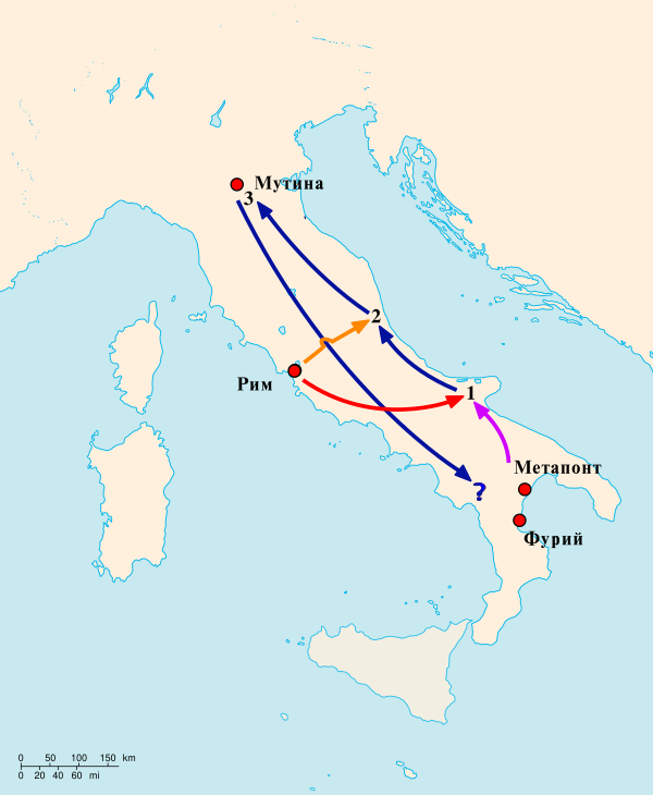 Спартак был вынужден осенью 71 года до н. э.[95] отступить на юг через Луканию к Мессине, располагающейся возле пролива, разделяющего Италию с Сицилией. Находясь на юге, Спартак договорился с киликийскими пиратами, обещавшими перевезти мятежников на Сицилию, где бы они смогли разжечь новые восстания рабов и собрать подкрепление. В то же время пропретор Сицилии Гай Веррес навлёк на себя всеобщее недовольство жестокостью и несправедливостью[96]. Под предлогом возможного нападения рабов он вымогал у сицилийцев припасы и оружие с целью собственного обогащения[96]. Предводителю пиратов Гераклиону требовалось время для сбора транспортных судов, так как на тот момент у него были лишь четыре миопарона, которые не годились для транспортных перевозок[97]. Но пираты не смогли выполнить своё обещание, возможно, из-за ухудшения погодных условий на море или интересов главного союзника пиратов, понтийского царя Митридата VI, заинтересованного в том, чтобы угроза Риму сохранялась непосредственно в Италии[98]. Также есть версия, что римляне подкупили пиратов. Плутарх пишет, что они просто обманули восставших[87].