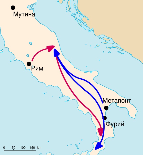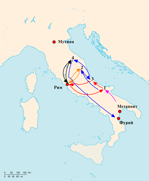 Аппиан утверждает, что на тот момент Спартак изменил своё намерение идти на Рим, ибо «он считал себя ещё не равносильным римлянам, так как войско его далеко не всё было в достаточной боевой готовности: ни один италийский город не примкнул к мятежникам», и решил уйти из южной Италии[79]. Мятежники захватили город Фурии с окрестностями и, вооружившись, стали совершать набеги на окружающие территории, грабить купцов, забирать у них бронзу и железо (из которых производили оружие), участвуя в столкновениях с римскими войсками, в которых также побеждали[79].