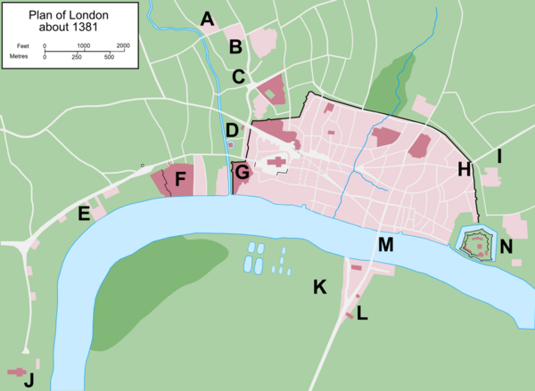 Десятилетие, предшествовавшее 1381 году, было тревожно и отмечено несколькими бунтами[54][55]. Центром волнений был Лондон, в котором активность цеховых гильдий и братств часто создавала проблемы для власти[56]. Лондонская элита не была едина; между её представителями не прекращались распри за политическую власть[57]. Недовольство горожан вызывало расширение роли королевского суда в столице, особенно суда Маршалси в Саутворке [58][59][комм. 3], также, раздражение жителей вызывали проживающие в городе иностранцы, в частности фламандские ткачи[60]. Особенной нелюбовью у лондонцев пользовался Джон Гонт, который был сторонником религиозного реформатора Джона Уиклифа, считавшегося еретиком[61]. Существовала лютая вражда между знатью и Гонтом, ходили слухи, что король мог назначить его на место выборного мэра[62].