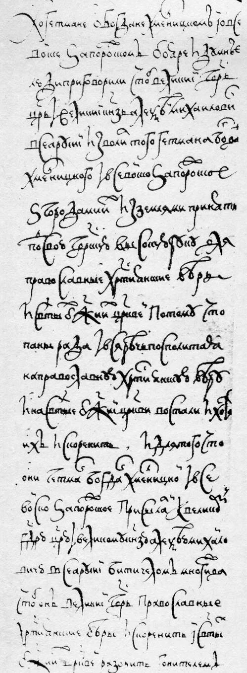 [Тв]орець избавитель наш Исус Христос, ужаловавшис кривдубогих людей и кривавих слез сирот бидних, ласкою и милосердем своим святим оглянувшися на нас, подобно, пославши слово своё святое, ратовати нас рачил. Которую яму под нами били викопали, сами в ню ся обвалили, же дви войска з великими таборами их помог нам Господь Бог опановати и трох гетманов живцем взяти з иншими их санаторами: перший на Жёлтой Води, в полю посеред дороги запорозкои, комисар Шемберк и син пана краковского ни з одною душею не втекли. Потом сам гетман великий пан краковский из невинним добрим чоловиком паном Мартином Калиновским, гетманом полним коронним, под Корсуном городом попали обадва в неволю, и войско все их квартянное до щадку ест розбито; ми их не брали, але тие люди брали их, которие нам служили [в той м]ире от царя кримского. Здалося тем нам и о том вашому [царскому] величеству ознаймити, же певная нас видомост зайш[ла от] князя Доминика Заславского, которий до нас присилал о мир просячи, и от пана Киселя, воеводи браславского, же певне короля, пана нашего, смерть взяла, так розумием, же с причини тих же незбожних неприятелей это и наших, которих ест много королями в земли нашой, за чим земля тепер власне пуста. Зичили бихмо соби самодержца господаря такого в своей земли, яко ваша царская велможност православний хрестиянский цар, азали би предвичное пророчество от Христа Бога нашего исполнилося, што все в руках его святое милости. В чом упевняем ваше царское величество, если би била на то воля Божая, а поспех твуй царский зараз, не бавячися, на панство тое наступати, а ми зо всим Войском Запорозким услужить вашой царской велможности готовисмо, до которогосмо з найнижшими услугами своими яко найпилне ся отдаемо.