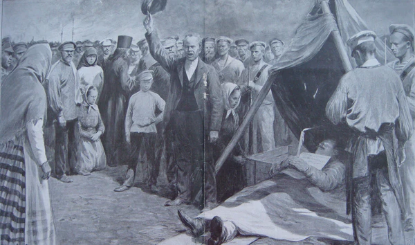 - Контакты с берегом. Стихийный митинг в порту у тела умершего от ран унтер-офицера Г. Н. Вакуленчука