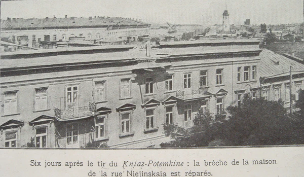 Броненосец неожиданно для правительственных сил дал три холостых «траурных» выстрела в память о Г. Н. Вакуленчуке и два выстрела из 6-дюймовых орудий боевыми снарядами по городу — вожаки восстания позднее уверяли, что хотели попасть в дома градоначальника и командующего войсками, но промахнулись, — направлявший орудия сигнальщик якобы нарочно дал неверный прицел. Один снаряд поразил чердак жилого дома в центральной части города, но жертв по счастью не было, второй — пролетел на окраину города, насквозь пробив дом Стрепетова на Бугаёвской улице, он не разорвавшись упал на территории сахарного завода Бродского[5]. После обстрела началось бегство состоятельной части населения из Одессы[14]:101.