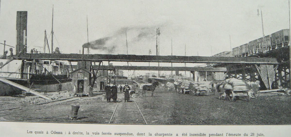 События идут с головокружительной быстротою. Забастовки, имевшие до сих пор в Одессе мирный характер, приняли 13 июня небывалое боевое настроение и выразились в целом ряде столкновений — рабочих с войсками и полицией. Начались столкновения 13 июня на Пересыпи. В тот же день вечером толпа на Пересыпи остановила движение поездов как конных, так и паровых, курсирующих на лиман. На другой день настроение населения, в особенности рабочих кварталов, сделалось ещё более напряжённым. Толпа заполнила центральные улицы, заставляя закрывать магазины и мастерские и приостанавливая движение конки. В некоторых местах были устроены баррикады из перевёрнутых вагонов конок, омнибусов, досок, кирпичей, камней и т. п., которые таскали из мест, где производятся постройки. В половине десятого вечера того же дня на Соборной площади, недалеко от собора, раздался взрыв динамитной бомбы, брошенной в городового Павловского, который хотел арестовать молодого человека, нёсшего бомбу; от городового осталась бесформенная масса. Сам же молодой человек, бросивший бомбу, скончался на руках врача «скорой помощи»… Но особенного напряжения достигло состояние населения 15-го утром. Город почти опустел. Всё время порядок в городе и в гавани ничем не нарушался. Только после полудня, когда масса рабочих, находившихся в порту с раннего утра, разошлась по домам, — возле пакгауза Нового Мола стала хозяйничать дикая толпа тёмных и бессознательных отбросов, пьяных босяков, воров и других любителей лёгкой наживы, сбегавшихся со всех концов города. С 5 часов вечера начался грабёж пакгаузов РО и РОПиТ. Начали с бочек с вином, которые быстро были разбиты, и вино полилось широкой рекой. Толпа быстро хмелела. Много чернорабочих до того перепились, что замертво сваливались у зданий пакгаузов. К 9 часам вечера толпа пьяных подростков стала зажигать ракеты и фальшфейера. Быстро загорались тюки хлопка, и через несколько минут огромные пакгаузы пылали, отбрасывая в тихое, ясное небо столбы дыма и огня. Приехал пожарный обоз Бульварного участка, но был осыпан градом лимонов, апельсинов и других предметов. Пожарные принуждены были отретироваться, и пламя беспрепятственно разлилось широким потоком по берегу гавани в сторону Пересыпи. Вскоре пылали склады, мастерские, баржи, несколько пароходов, портовая Николаевская церковь, эстакада. Огонь подбирался к мастерским РОПиТ и газовому заводу. Но усиленные отряды войска, находившиеся в этих местах, не дали огню распространиться дальше. Все выходы в порт были заняты усиленными патрулями войск. На бульваре и возле памятника Екатерине II стояли казаки, которые разгоняли толпу. В этом месте была брошена бомба, взрыв которой ранил несколько казаков. Сгорели три парохода Российского общества (РО) и два парохода РОПиТ, нагруженные товарами… С утра 17 июня начались похороны найденных трупов чернорабочих и других неизвестных лиц, сгоревших и убитых в районе порта.