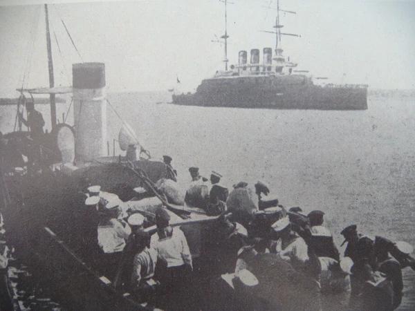 Командир приказал сыграть общий сбор и отправился на место построения по такому случаю — на ют корабля. Команда броненосца выстроилась там в обычном для таких случаев построении — по правому и левому борту. Строевые офицеры, по долгу службы обязанные присутствовать на подобных построениях, собрались у кормового флага, прочие (инженеры-механики, корабельный священник) продолжали обедать в кают-компании. Перед построением капитан Е. Н. Голиков связался с миноносцем № 267 и приказал ему «быть готовым к походу»[18].