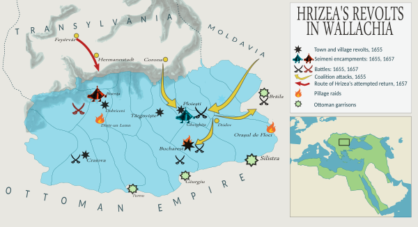 Восстание сейменов и домобранцов — самое значительное событие в истории Дунайских княжеств XVII века. Оно вспыхнуло 26 и 27 февраля 1655 г. против правления Константина Щербаня и погибло со смертью Хризея. [1][2] Восстание охватило и Молдову — Яссы и Сучаву, где 1000 сейменов служат под командованием Георгия Стефана. [3]