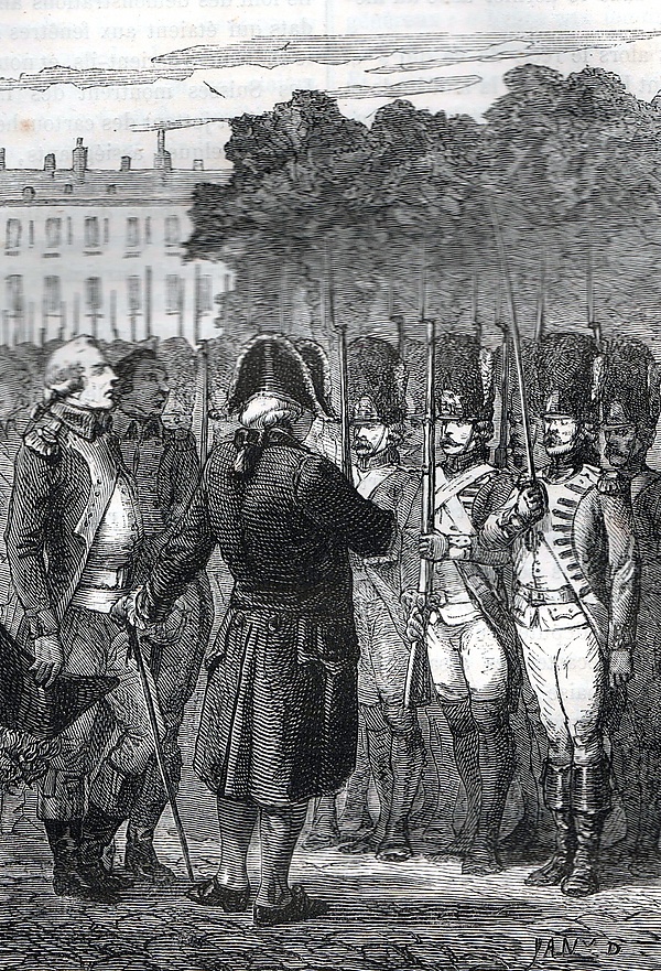 Таким образом, когда примерно в семь утра авангард повстанцев был замечен в задней части дворца, там не было никого, чтобы отдавать приказы. Людовик, сонно инспектируя свой гарнизон, «при полном параде, со шпагой на боку, пудрой, сыпавшейся с волос парика», был встречен криками национальных гвардейцев «Да здравствует нация!» и «Долой вето!» (фр. A bas le véto!). Людовик ничего не сказал и вернулся в Тюильри. За ним в строю вспыхивали перепалки. Артиллеристы громко заявляли, что не будут стрелять в своих братьев[27].
