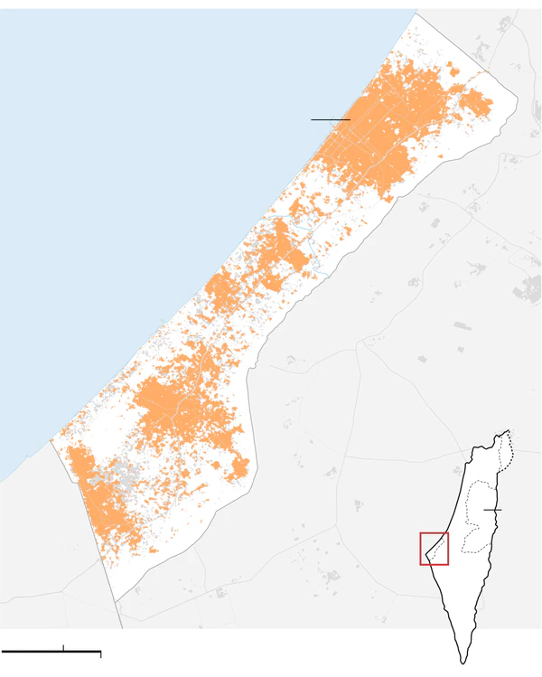 В секторе Газа только на февраль 2024 года было повреждено 80 000 сооружений, подсчитал менеджер Центра географической информационной системы Еврейского университета в Иерусалиме Ади Бен-Нун[3]. Согласно анализу карт со спутников UNOSAT, в сентябре 2024 года в секторе было 52 564 разрушенных сооружения, 18 913 серьезно поврежденных сооружений, 56 710 умеренно поврежденных сооружений и 35 591 возможно поврежденное сооружение, что в общей сложности составляет 163 778 сооружений, это примерно 66 % от общего числа строений в секторе Газа. Больше всего разрушений отмечено в районах Хан-Юнис и Рафах[4].