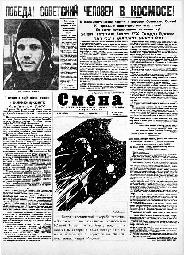 На корабле «Восток» 12 апреля 1961 года лётчик-космонавт СССР старший лейтенант ВВС (после полёта он получил сразу звание майора[8]) Юрий Алексеевич Гагарин совершил первый в мире пилотируемый полёт в космическое пространство[7].