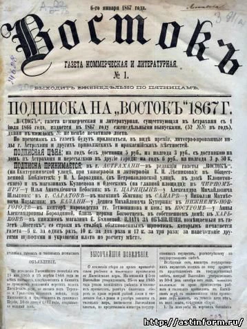 Еженедельная коммерческая и литературная газета «Восток» выходила в Астрахани с 1 июля 1866 года по 29 декабря 1867 года.