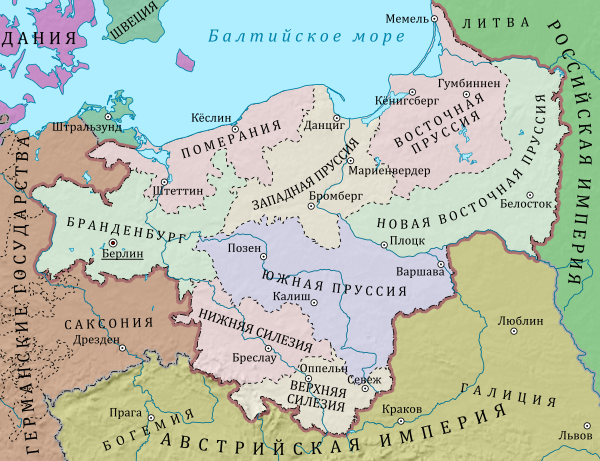 В 1773 году Прусская провинция стала именоваться Восточной Пруссией. Позднее при разделах Польши, являясь частью Прусского раздела, провинция была разделена на Западную и Восточную Пруссию. В 1824 году обе провинции были объединены и в течение 50 лет административная система объединённой провинции не менялась. В январе 1871 года произошло объединение Германии и образование Германской империи. В 1878 году произошло разделение Восточной и Западной Пруссии, и Восточная Пруссия стала самостоятельной провинцией Германской империи.