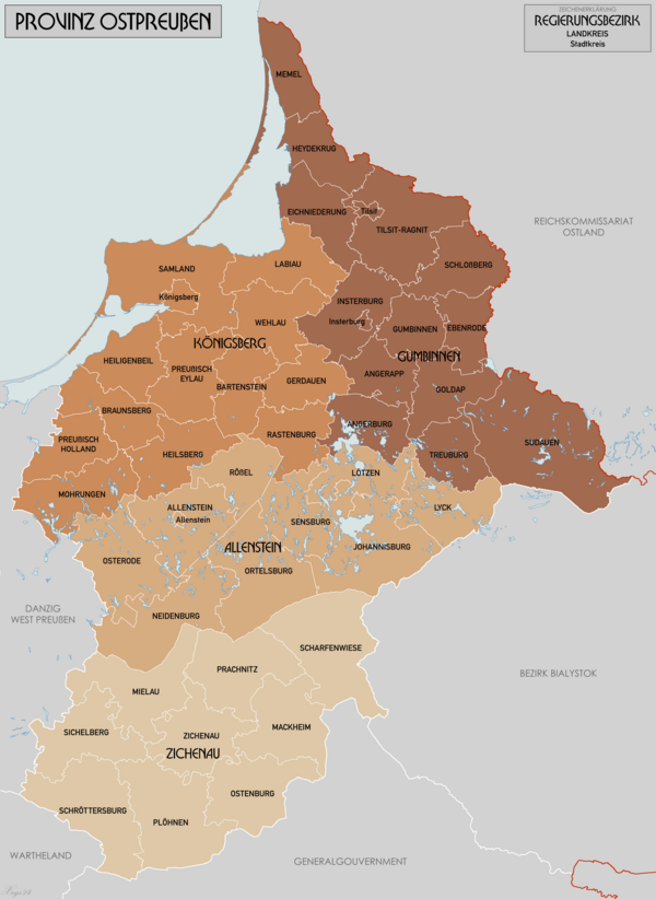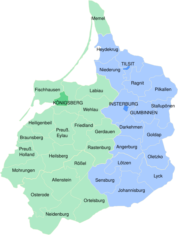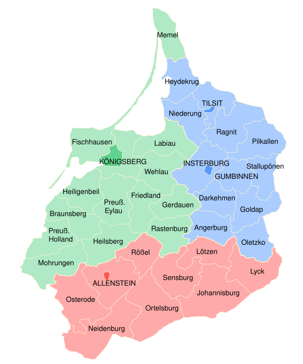 1 ноября 1905 года из южных частей округов Кёнигсберг и Гумбиннен был образован самостоятельный округ Алленштейн[6]. 10 января 1920 года в соответствии с решениями Версальского договора Мемельланд выходит из состава Пруссии и переходит под управление Лиги Наций, а части района Найденбург (округ Алленштейн) переходят под контроль Польши. В то же время под управление Восточной Пруссии переходят город и район Эльбинг (ранее входившие в округ Данциг провинции Западная Пруссия).