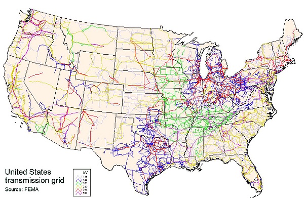 Все электрические подсети Восточной синхронной сети в нормальных условиях электрически связаны друг с другом и работают на номинальной синхронной частоте 60 Гц. Восточное соединение простирается от Центральной Канады до побережья Атлантического океана (за исключением Квебека), на юг до Флориды и на запад до подножья Скалистых гор (за исключением большей части Техаса).